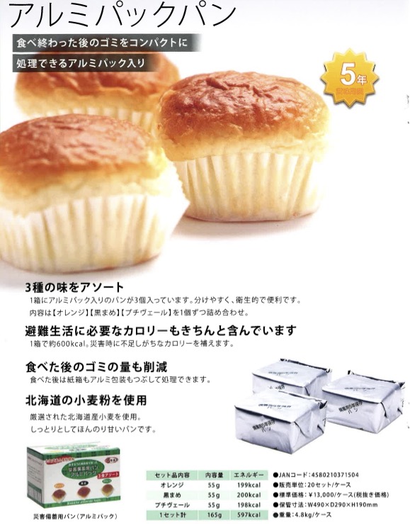 アルミパックパン20個入り アルミパックパン (as02) 3種の味をアソート 避難生活に必要なカロリーをきちんと含んでいます 1箱で約600kcal、災害時に不足しがちなカロリーを補えます 食べた後のゴミの量も削減 食べた後は紙箱もアルミ包装もつぶして処理できます 北海道の小麦粉を使用 厳選された北海道産小麦を使用 しっとりとしてほんのり甘いパンです こちらの商品は銀行振込のみ対応となります 1ロット/20個入り 在庫状態 : 在庫有り ¥14,040 ¥9,180(税込) 数量ロット