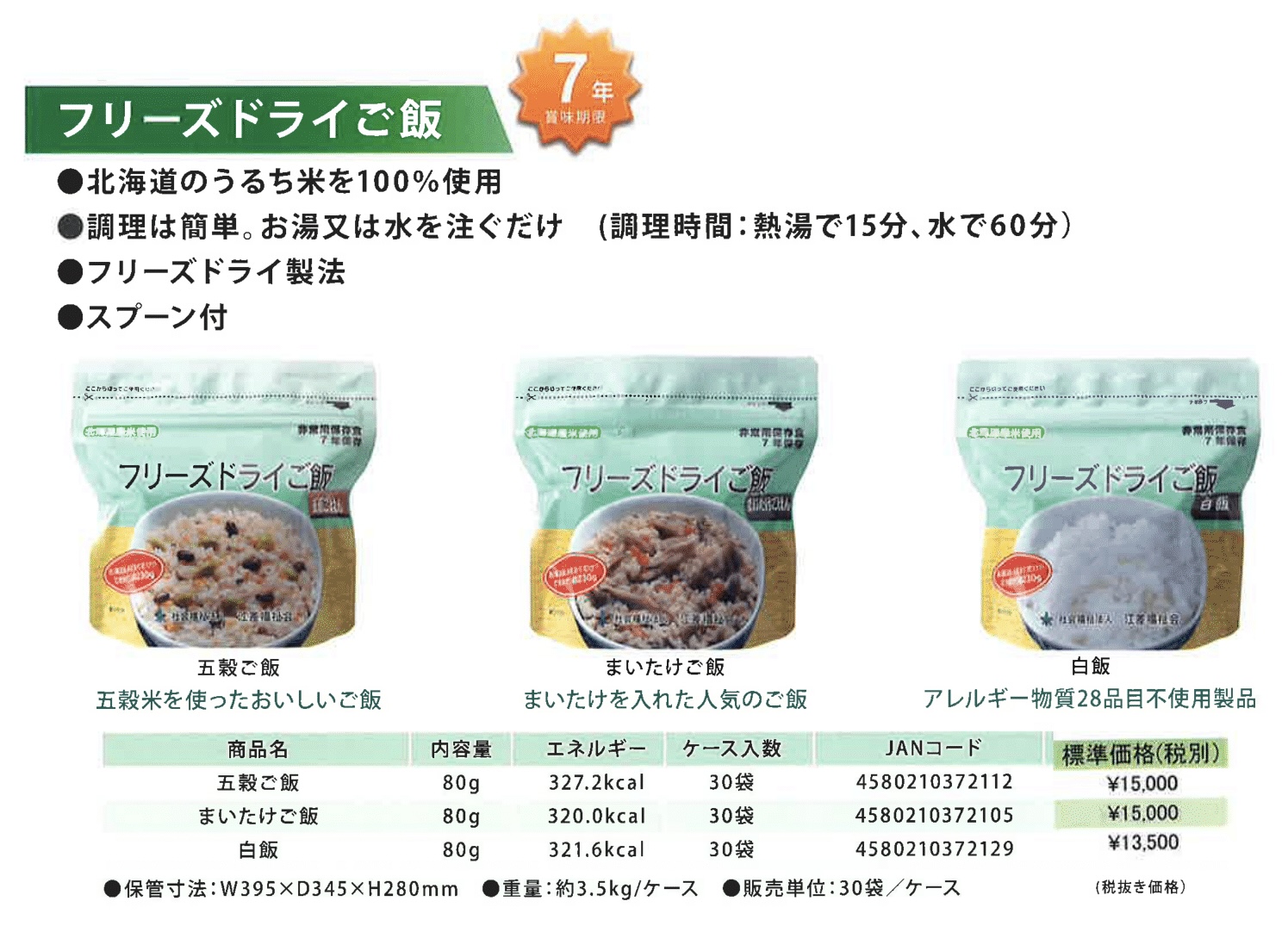 フリーズドライご飯30袋入り フリーズドライご飯 (as04) 北海道のうるち米を100%使用 調理は簡単、お湯を又は水を注ぐだけ (調理時間:お湯で15分、水で60分) フリーズドライ製法 スプーン付 こちらの商品は銀行振込のみ対応となります 1ロット/30袋入り(白飯) 在庫状態 : 在庫有り ¥14,580 ¥8,100(税込) 数量ロット 1ロット/30袋入り(五穀ご飯) 在庫状態 : 在庫有り ¥16,200 ¥9,720(税込) 数量ロット 1ロット/30袋入り(まいたけご飯) 在庫状態 : 在庫有り ¥16,200 ¥9,720(税込) 数量ロット